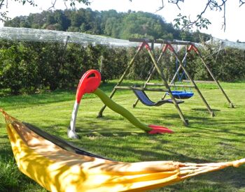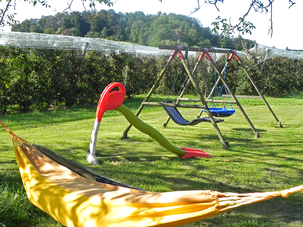 Für Kinder stehen Nestschaukel, Rutsche, Bobbycar, Dreirad und Kindertraktor bereit.